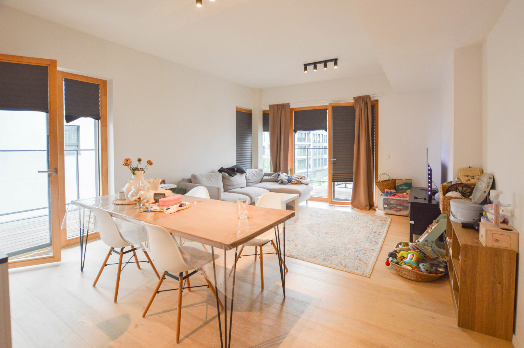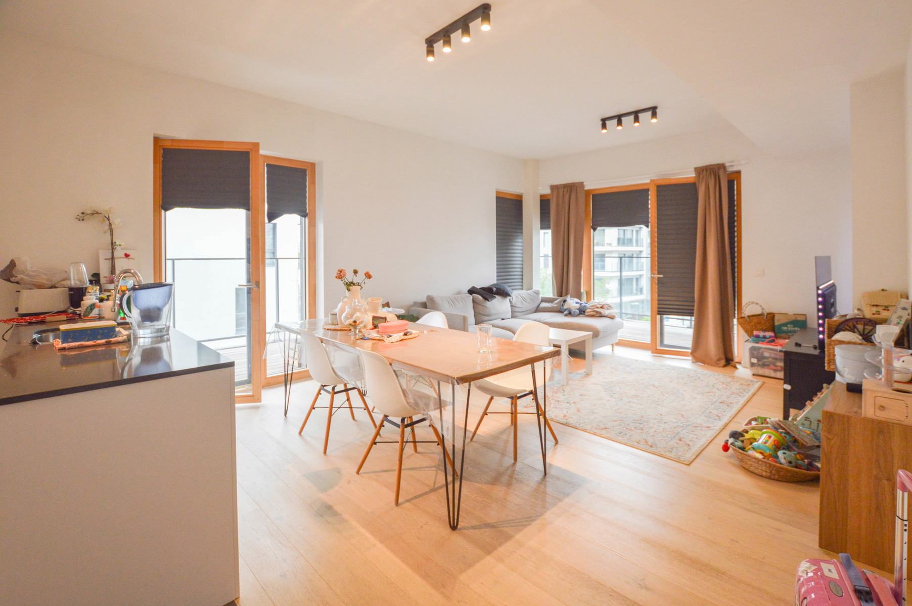 L'appartement se compose d'un hall d'entrée, d'un vaste séjour lumineux avec cuisine équipée ouverte, d'une buanderie pratique, de deux chambres confortables, d'une salle de bain avec baignoire et douche intégrée ainsi que d'un WC séparé. La pièce de vie donne accès à une magnifique terrasse en angle, offrant une double orientation et un espace extérieur idéal pour profiter des beaux jours.